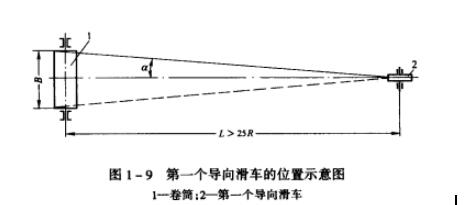 3、第一個導向滑車距卷軸線距離應大于卷筒長度的25倍,以保證偏角a<2°,如圖1-9所示,這樣繞上卷筒的鋼絲繩才可按順序安排,不致纏繞在一起;