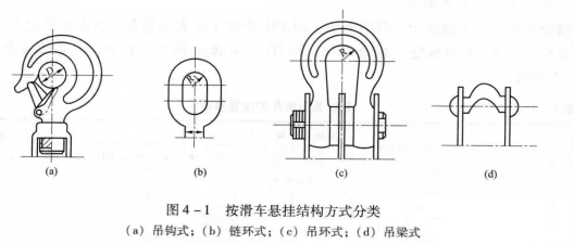 按滑車(chē)懸掛結(jié)構(gòu)方式(或稱(chēng)連接方式)分為吊鉤式、鏈環(huán)式、吊環(huán)式和吊梁式4種,如圖4—1所示。