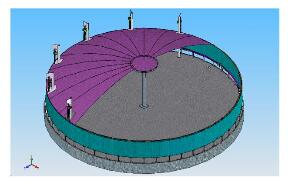 3、立中心傘架,如為拱頂罐安裝頂蓋,頂板立柱處開(kāi)天窗: