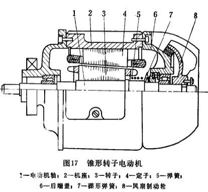 當電動機通電后,錐形轉(zhuǎn)子3受到軸上磁拉力作用,此力克服彈簧5的壓力,使錐形轉(zhuǎn)子或電動機軸1向右作軸向移動,從而使定在錐形轉(zhuǎn)子軸上的風(fēng)扇制動輪8與電動機的后端蓋6脫開,此時,電動機即可自由轉(zhuǎn)動。斷電后,磁拉力消失,錐形轉(zhuǎn)子在彈簧的壓力作用下,連同軸1上的風(fēng)扇制動輪向左移動,直至風(fēng)扇制動輪與電動機后端蓋緊密接觸為止。這時在它們的接觸面上所產(chǎn)生的摩擦力矩,將電動機制動住。