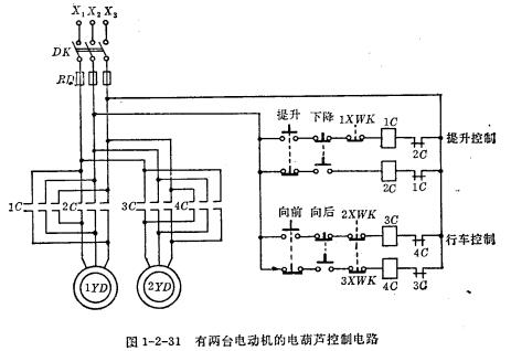 圖1-2-31為有兩臺電動機的電葫蘆控制電路。1YD為提升用電動機,2YD為行車用電動機,控制電路的工作原理與上述相同,不再重復。