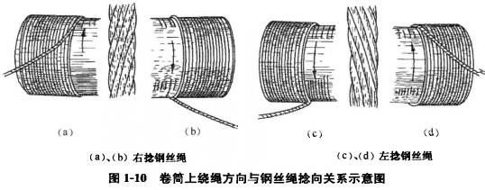 1、纏繞。如由鋼絲繩卷直接往起升就卷筒上纏繞時(shí),應(yīng)注意兩點(diǎn):一是應(yīng)把整卷鋼絲繩架設(shè)在專用的旋轉(zhuǎn)托架或支座上,松卷時(shí)的轉(zhuǎn)動(dòng)方向應(yīng)與起升機(jī)構(gòu)卷筒上纏繞的方向一致;而是卷筒上的繩槽走向應(yīng)同鋼絲繩的捻向相適應(yīng)。如果鋼絲繩在繩槽方向是從左向右,鋼絲繩是右捻,要從卷筒上方引入卷繞,如圖1-10(a)所示;倘若鋼絲繩在繩槽走向是從右向左,鋼絲繩是右捻,則要從卷筒下方引入卷筒,如圖1-10(b)所示;若鋼絲繩在繩槽走向是從左向右,鋼絲繩是左捻、要從卷筒下方引入卷繞,如圖1-10(c)所示;如果鋼絲繩在繩槽走向是從右向左,剛繩是左捻,則要從卷筒上方引入卷繞,如圖1-10(d)所示。