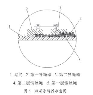 采用單根鋼絲繩雙層同向纏繞的方式:鋼絲繩兩端分別固定于卷筒的同一端部,鋼絲繩的一端在卷筒上卷繞形成第一層鋼絲繩,鋼絲繩的另一端在卷筒與第一層鋼絲繩上卷繞形成第二層鋼絲繩。同時卷筒上安裝有防止第一層鋼絲繩亂繩的第一導(dǎo)繩器,第一層鋼絲繩上安裝有防止第二層鋼絲繩亂繩的第二導(dǎo)繩器,2個導(dǎo)繩器之間向固定連接,如圖6所示。運(yùn)行時,第一導(dǎo)繩器與第二導(dǎo)繩器同時工作,向相同方向移動,從而實(shí)現(xiàn)兩層鋼絲繩能同時卷繞或釋放,進(jìn)而實(shí)現(xiàn)在電動葫蘆體積不變的情況下,起升高度幾乎是原電動葫蘆的2倍,大大提高了電動葫蘆的起升高度。