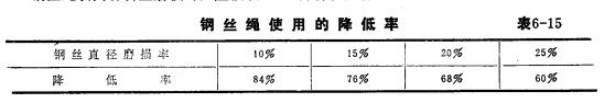 鋼絲繩表面有明顯磨損時(shí),應(yīng)按表6—15降低使用標(biāo)準(zhǔn)。