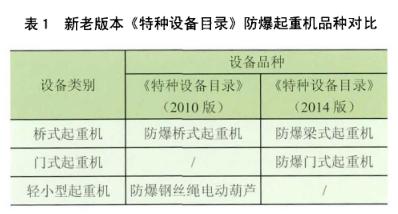 國家質(zhì)檢總局與2014年新修訂的《特種設(shè)備目錄》(2014年第114號文),相較與老版《特種設(shè)備目錄》(2010版),防爆起重機(jī)品種的變化見表1.其中,在橋式起重機(jī)中,防爆橋式起重機(jī)和防爆梁式起重機(jī)合并為防爆橋式起重機(jī);在門式起重機(jī)中,新增加防爆門式起重機(jī)品種;在輕小型起重機(jī)中,隨著正規(guī)輕小型起重機(jī)大類的取消,防爆鋼絲繩電動葫蘆和防爆氣動葫蘆也隨之取消。