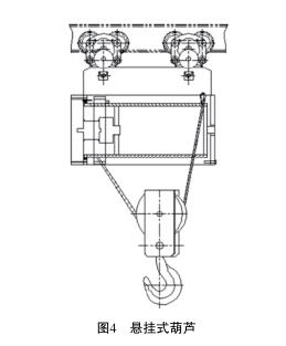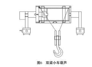 三合一內(nèi)平動卷筒作為緊湊型起升機構驅(qū)動裝置,可以替換目前的電動葫蘆卷筒,形成各種各樣的電動葫蘆。如圖4所示,與普通的CD型鋼絲繩電動葫蘆的運行小車一起組成懸掛式電動葫蘆,如圖5所示,構成低凈空鋼絲電動葫蘆,圖6是雙梁小車式鋼絲繩電動葫蘆。