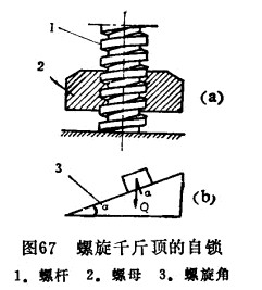 ? 當(dāng)螺旋角大于摩擦角(即α>φ)時,被頂起的重物在自重作用下,自動產(chǎn)生下滑的現(xiàn)象,成為自落。LQ—50型螺旋千斤頂采用梯形雙線螺桿,其螺旋角大于摩擦角,這種螺旋千斤頂則具有自落能力。故重物被頂升后,需要停止時,另設(shè)有制動裝置。