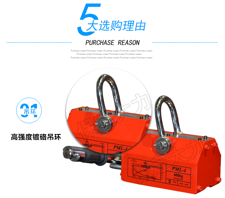 永磁起重器,全部采用N 4 O高牌號釹鐵繃為磁源,內(nèi)部磁路設(shè)計合理、結(jié)構(gòu)獨(dú)特、焊接材料特殊、密封性能好、外觀設(shè)計別致、定位正確。因此該產(chǎn)品與國內(nèi)同類產(chǎn)品相比、具有體積小、吸力大、剩磁小、軸頭不易斷裂、壽命長等各種優(yōu)點(diǎn)。