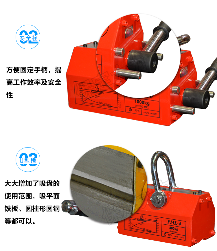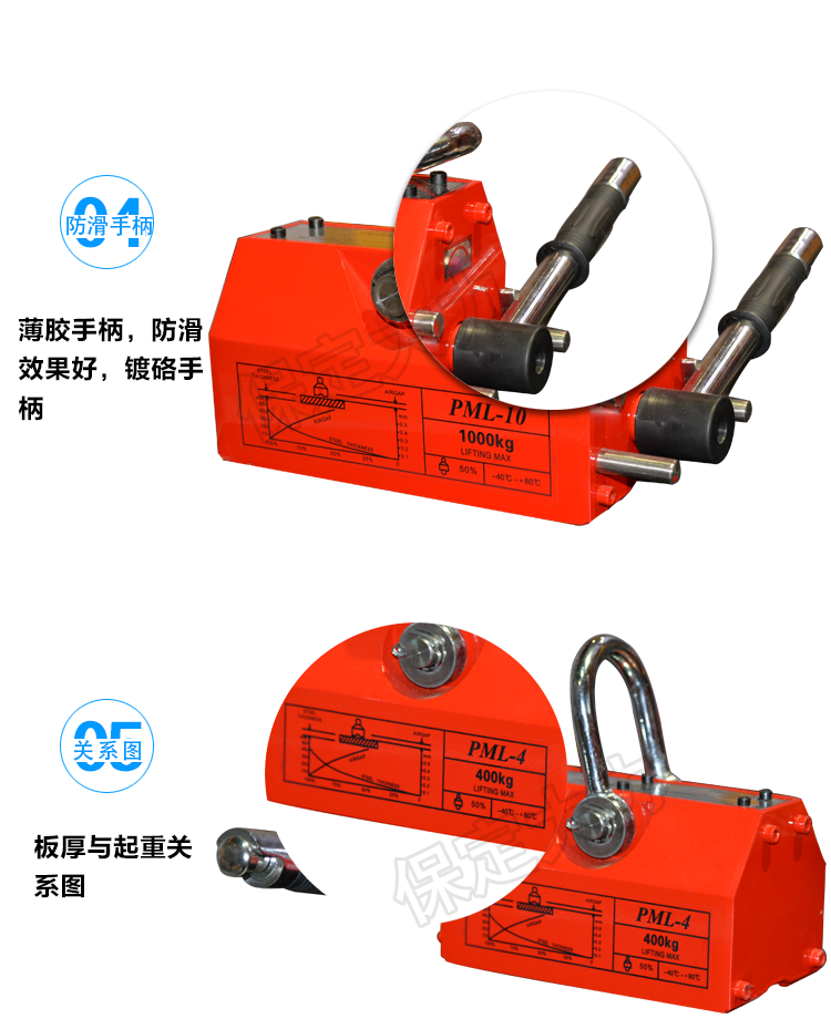 永磁起重器主要的一點(diǎn)不需用電。這種永磁起重器是一種無電源起重設(shè)備。永磁起重器吸力安全系數(shù)×3.5倍,永磁起重器采用高性能稀土永磁一釹鐵硼為磁源,具有不耗電,吸力強(qiáng)、剩磁低、操作輕便、壽命長、安全可靠等特點(diǎn),永磁起重器結(jié)構(gòu)先進(jìn),按照出口標(biāo)準(zhǔn)組織生產(chǎn)。永磁起重器廣泛用于機(jī)械工業(yè)、模具制造業(yè)、倉庫和交通運(yùn)輸?shù)炔块T搬運(yùn)鋼板、鋼錠等導(dǎo)磁性物體。 永磁吸盤適用于搬運(yùn)鋼板、鐵塊及圓柱鐵材。如機(jī)械零件、沖床模具及各類鋼鐵材料。